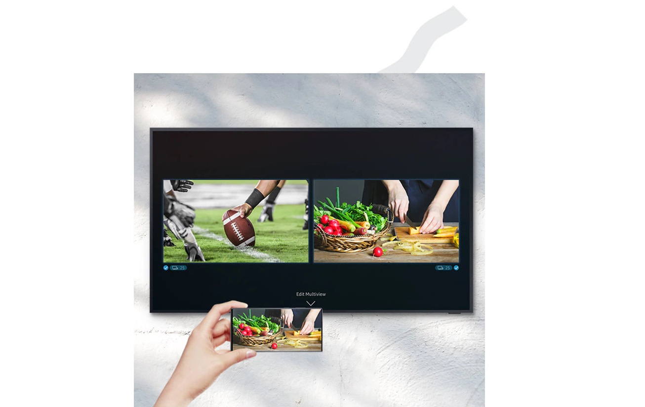 Multi View rozděluje vaši televizní obrazovku na dvě části, přičemž obsah, který sledujete, je umístěn na jedné straně a zrcadlí obrazovku vašeho mobilního telefonu na straně druhé. To znamená, že se už nemusíte dívat mimo televizní obrazovku, abyste viděli na svůj telefon.
